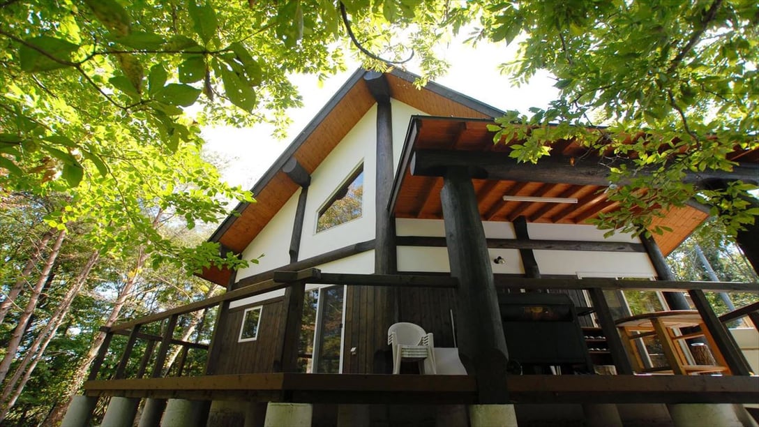 ハグ柱とハンモックが特徴的な、2階建てロフト付きのログコテージ