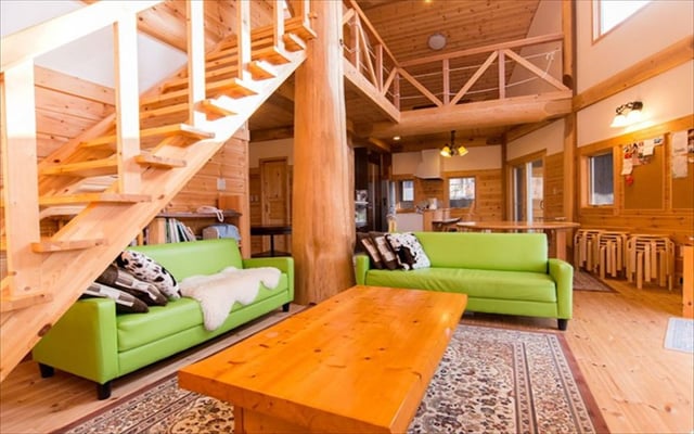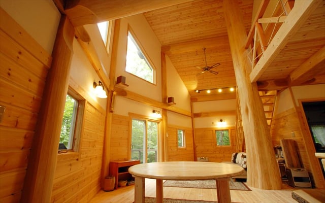 極太丸太の柱が特徴的な、2階建てロフト付きのログコテージ