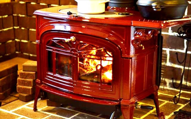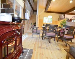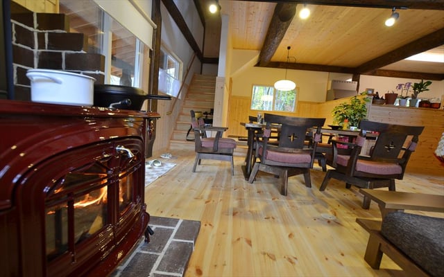 暖炉の炎がお部屋を暖めます。薪ストーブの前でゆっくりコーヒーをお召し上がりください。