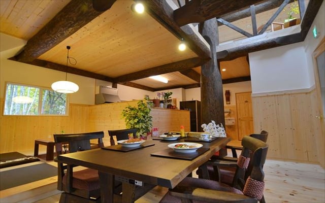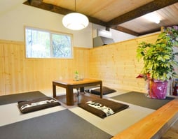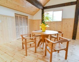 極太丸太の柱と琉球畳の小上がりが特徴的な、2階建てロフト付きのログコテージ